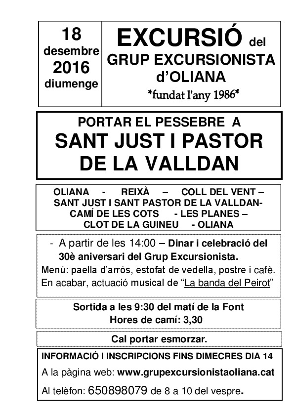 Pessebre a Sant Just i Pastor de la Valldan (30è aniversari) 18 de desembre, sortida des de la font. Dinar i celebració al pavelló.