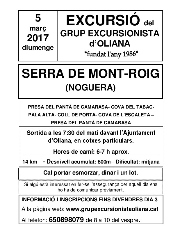 Sortida el diumenge 5 de març de 2017 a les 7:30h des d'