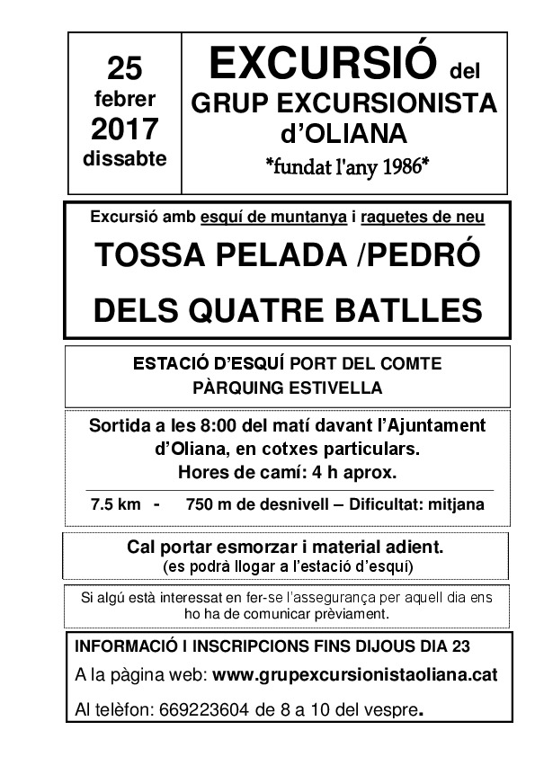 Esquís i raquetes al Pedró dels Quatre Batlles Sortida el dissabte 25 de febrer de 2017 a les 8:00h des d'Oliana.