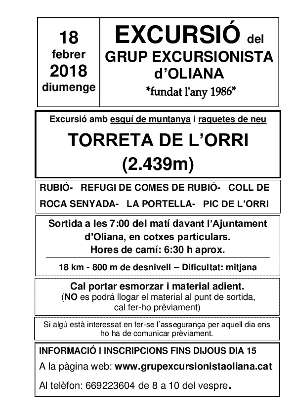 Esquís i raquetes al Pic de l'Orri Sortida el diumenge 18 de febrer de 2018 a les 7:00h des d'Oliana.